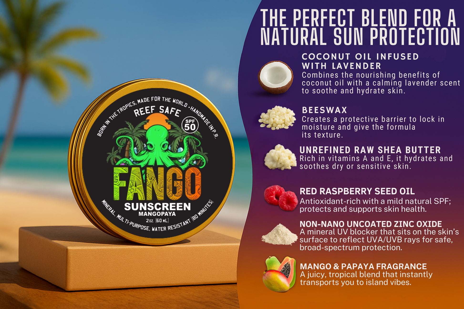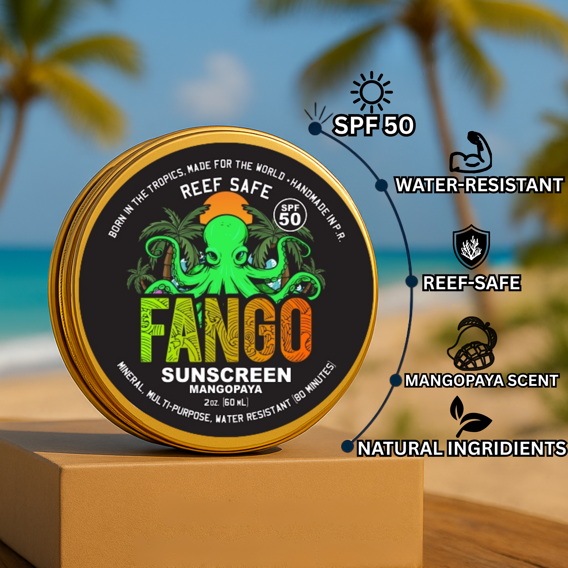 Experience the ultimate blend of mango + papaya scent and protection with Fango Sunscreen! Our natural formula is infused with love from nature, providing powerful sun protection of 50 SPF without any harsh chemicals in a tin.